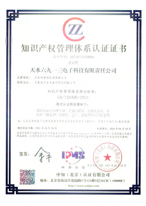 天水六九一三電子科技有限責(zé)任公司取得了由中知(北京)認(rèn)證有限公司頒發(fā)的知識產(chǎn)權(quán)管理體系認(rèn)證證書。